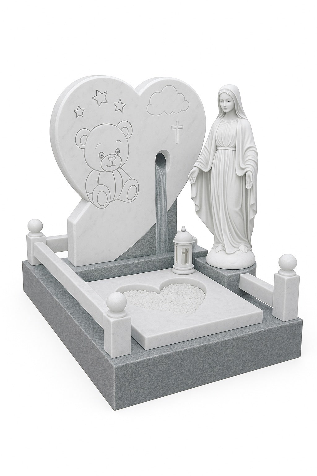 Светлый и душевный памятник, созданный для увековечения памяти о ребёнке. Основная стела в форме сердца выполнена из белоснежного мрамора Тассос Вайт, украшена нежной гравировкой медвежонка, облака, звёзд и креста — символов детской чистоты и небесной опеки. Сквозное отверстие в центре стелы придаёт композиции лёгкость и символизм.