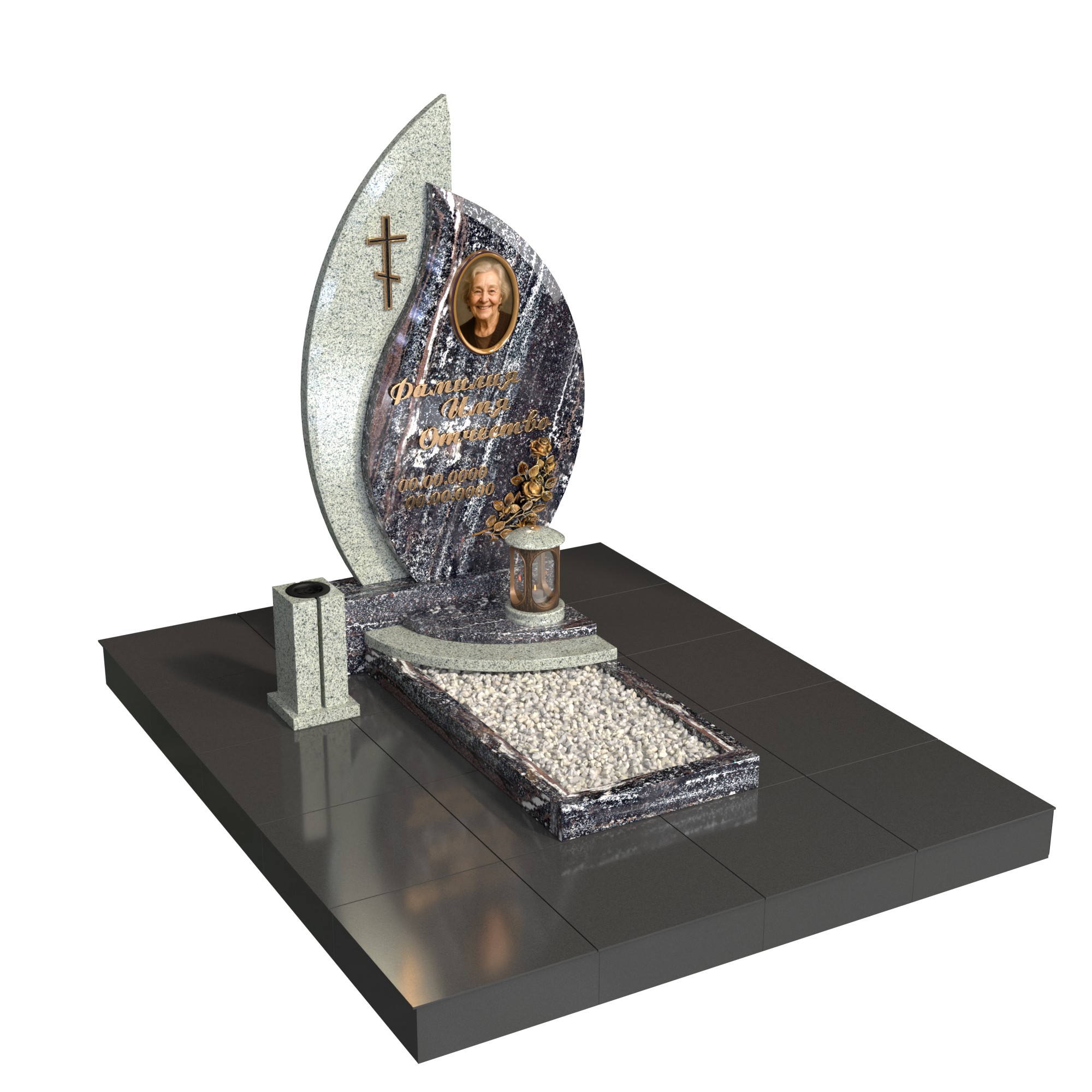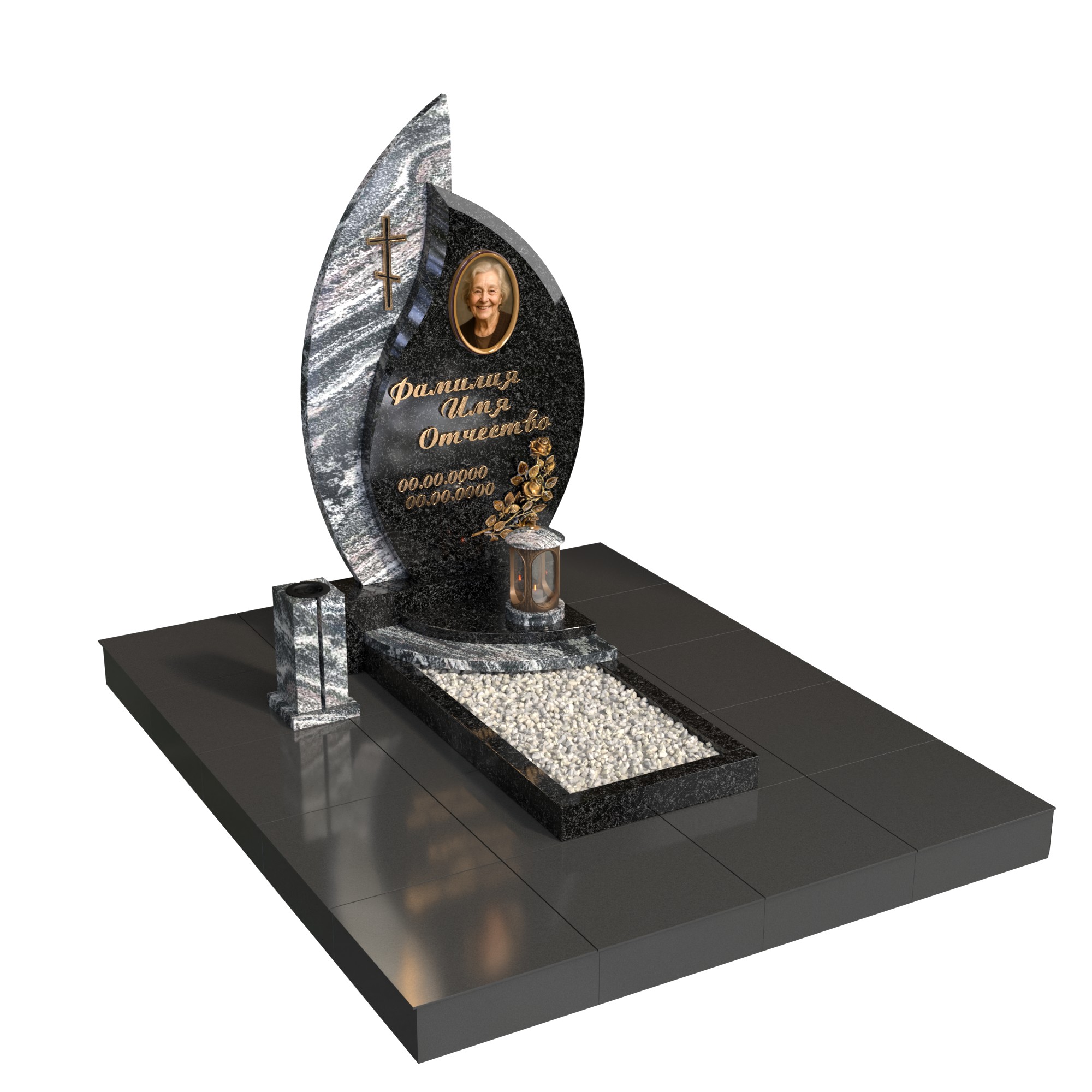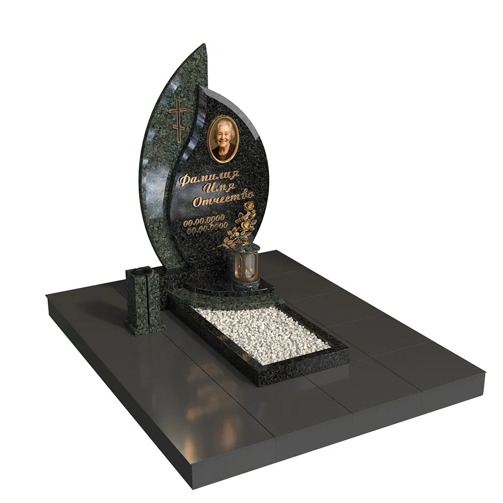 Одиночный памятник «Лист вечности» — современная модель с фигурной стелой в форме листа/пламени, овальным портретом и аккуратным цветником с белым щебнем. Полированная поверхность, чёткая геометрия и лаконичный крест создают торжественный, но тёплый образ. Памятник из натурального гранита устойчив к морозу, дождю и выцветанию, легко сохраняет первоначальный вид десятилетиями.