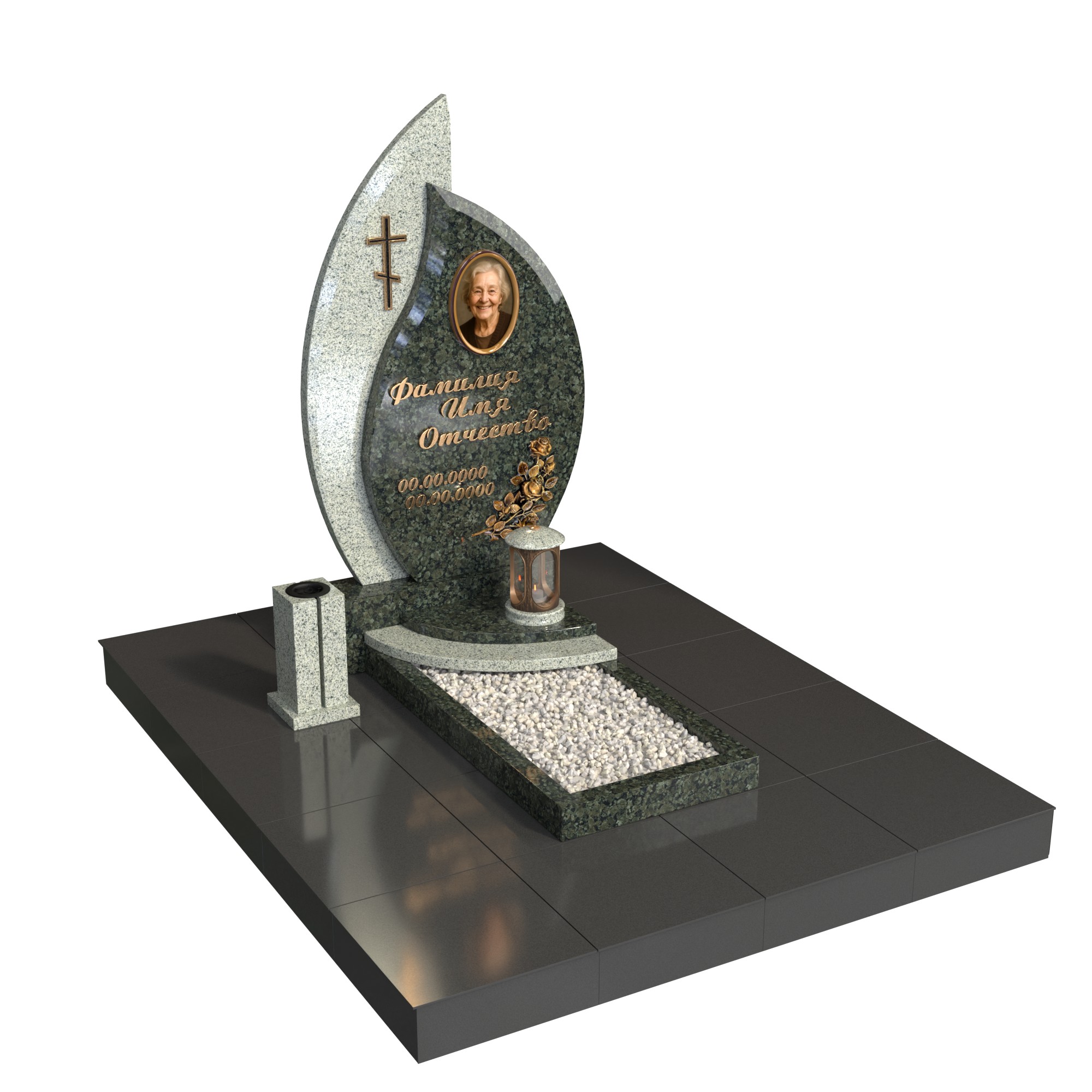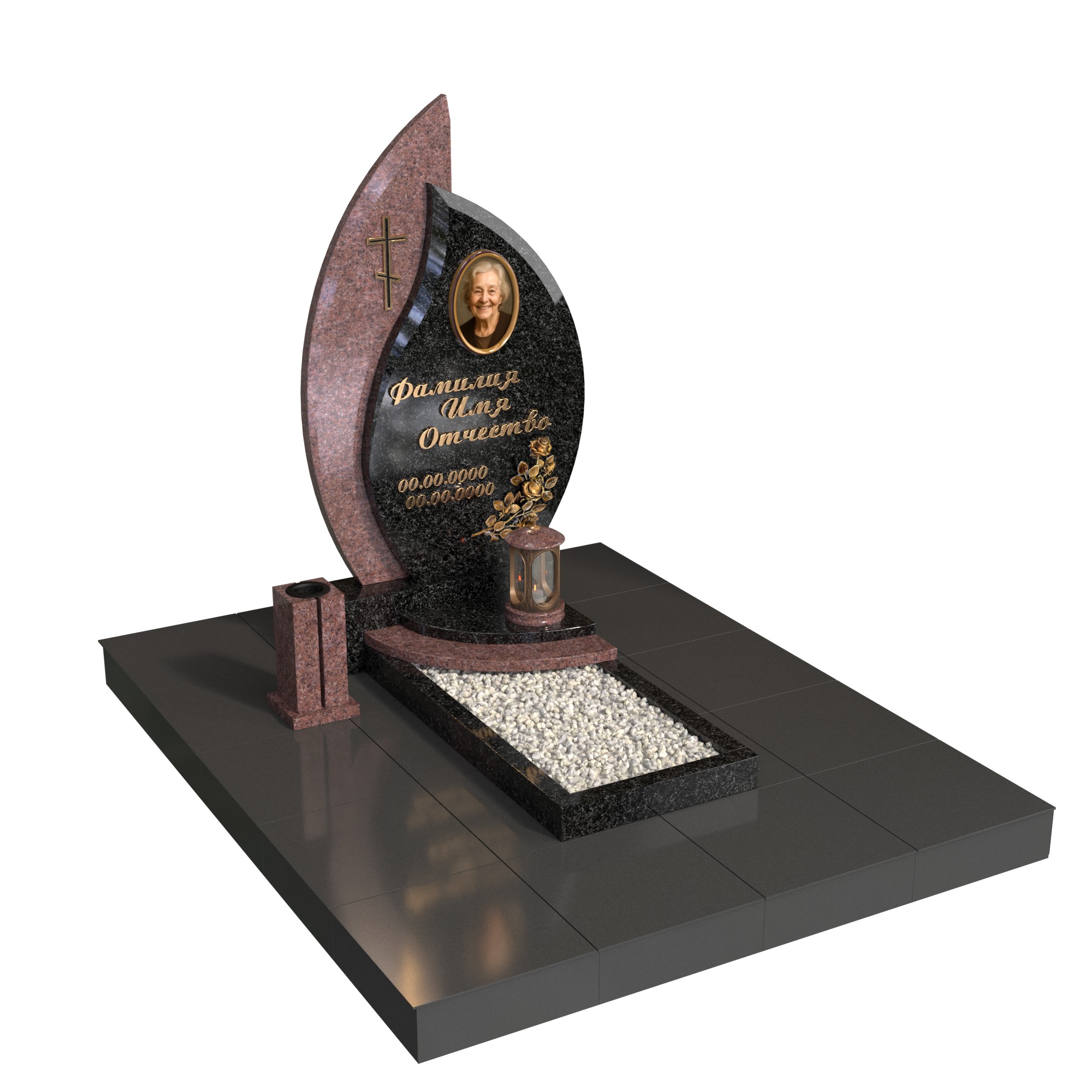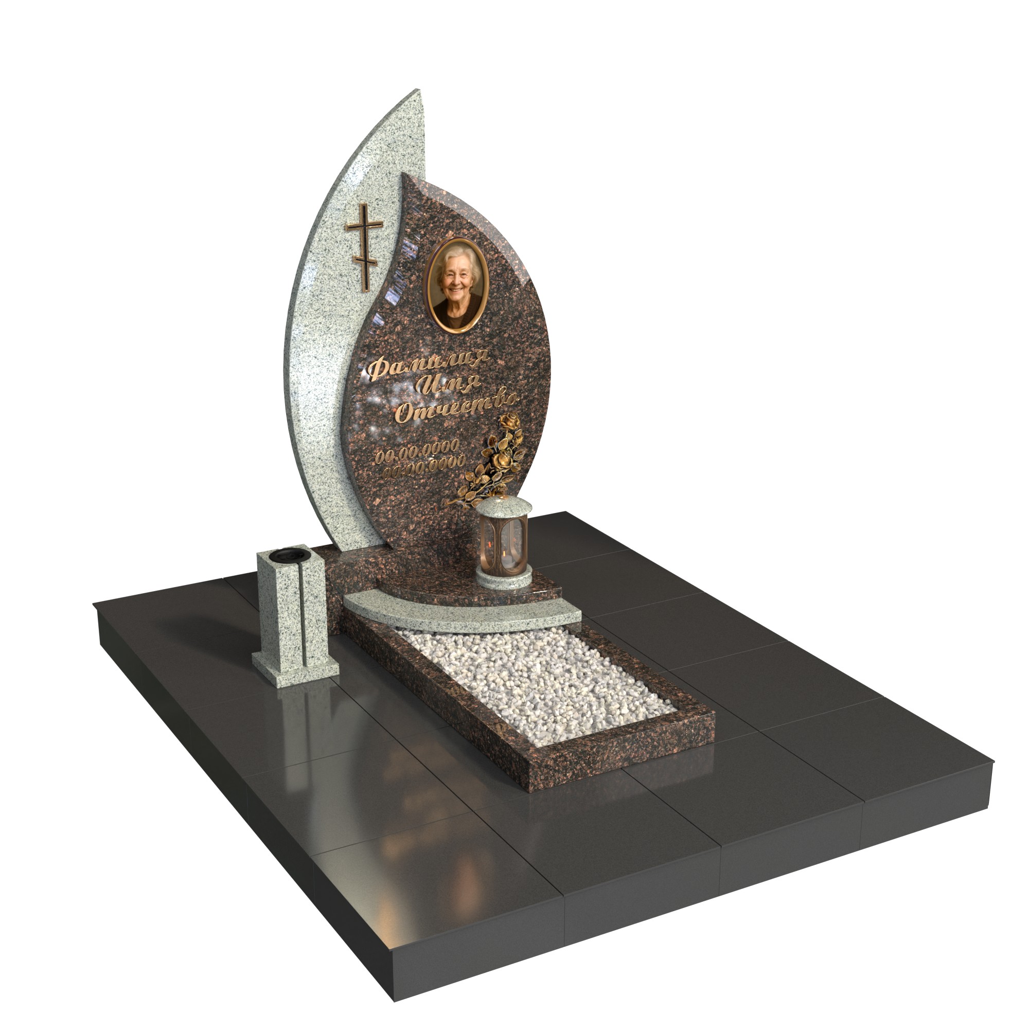 Одиночный памятник «Лист вечности» — современная модель с фигурной стелой в форме листа/пламени, овальным портретом и аккуратным цветником с белым щебнем. Полированная поверхность, чёткая геометрия и лаконичный крест создают торжественный, но тёплый образ. Памятник из натурального гранита устойчив к морозу, дождю и выцветанию, легко сохраняет первоначальный вид десятилетиями.